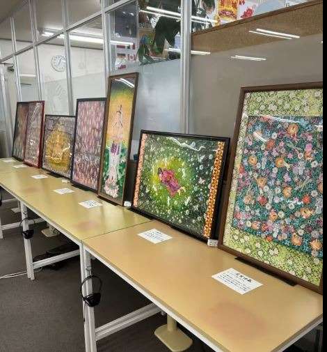 野洲の図書館で開催された個展を教室で再現して頂けました。32点の作品を一挙公開で、一つ一つ見ごたえありすぎて「どうやって描かれているの?」とお客様のお声に、マーカーペンでドットをたくさん描いて、下書き無しで絵が浮かび上がってくる感じと伺って、天才すぎて想像つかない世界でした。絵に囲まれて、教室がパワースポットになりました。Cafeコーナー