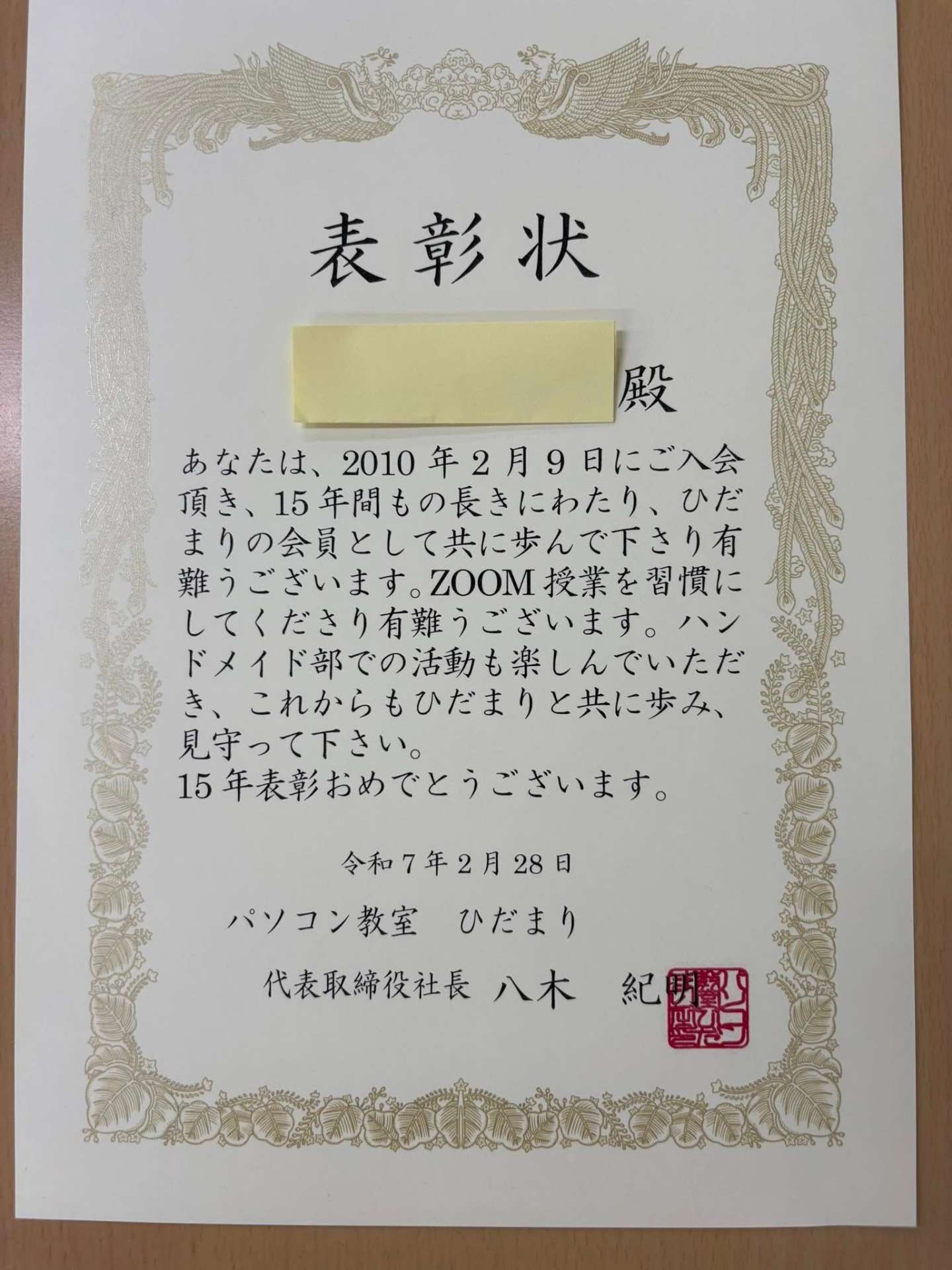 ひだまり15年表彰でN村さまに表彰状と記念の観葉植物をお渡しさせて頂きました。ひだまりの会員として共に歩んで下さりありがとうございます毎日の授業はZOOMで行って下さってハンドメイドの活動も楽しん…