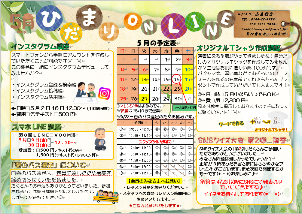こんにちは!パソコン教室ひだまり高島教室です。美しい桜が散り、いよいよ新緑の季節がやってきますね!5月のオンラインが仕上がりました♪5月もイベント、プチ講座など楽しい講座を予定しております。皆…